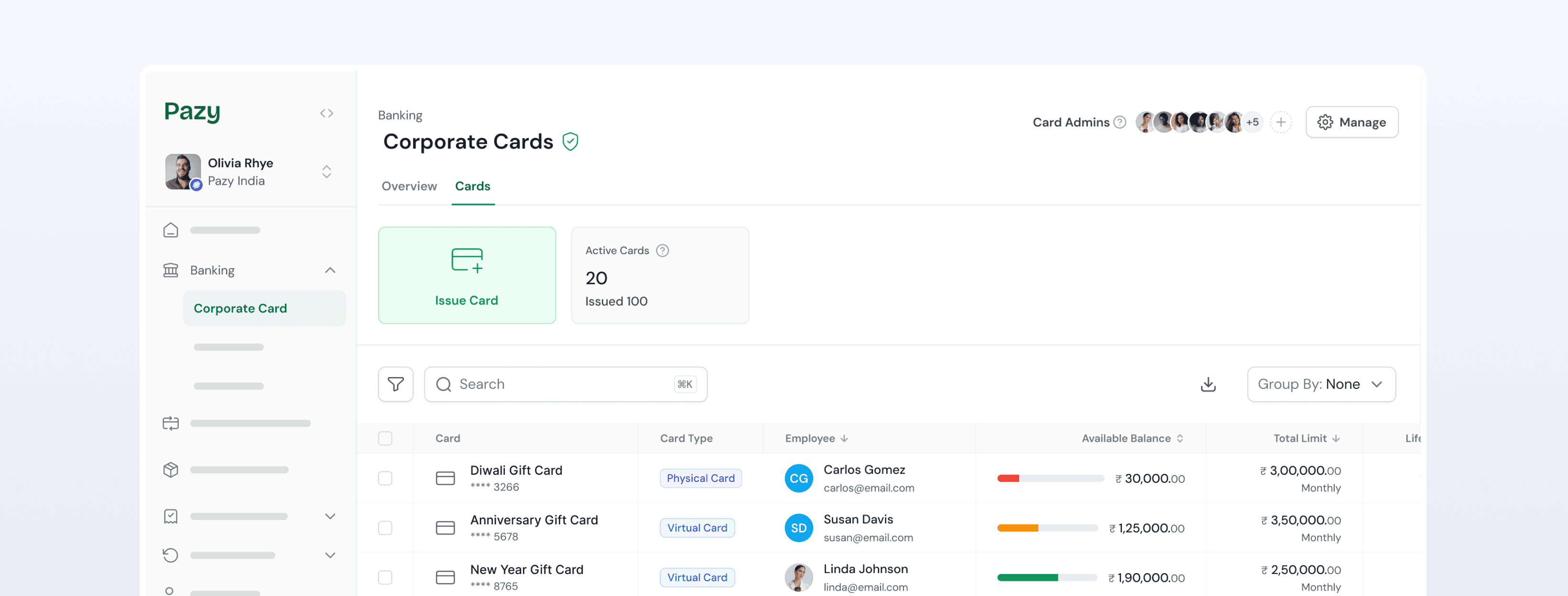 Stop juggling balances across dozens of cards. Maintain a single master account and let Pazy automatically route funds to cards based on their limits and rules. Pay vendors, utilities, and even BBPS portals directly.
